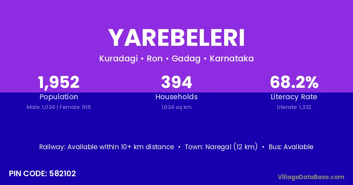 Naregal (12 km) is the nearest town to Yarebeleri village for major economic activities and is located approximately 12 km away.