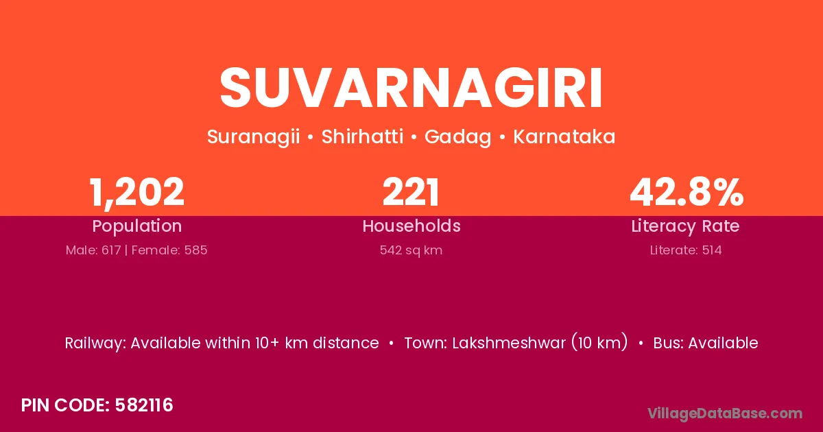 According to Census 2011 information, the village code of Suvarnagiri village is 582116.