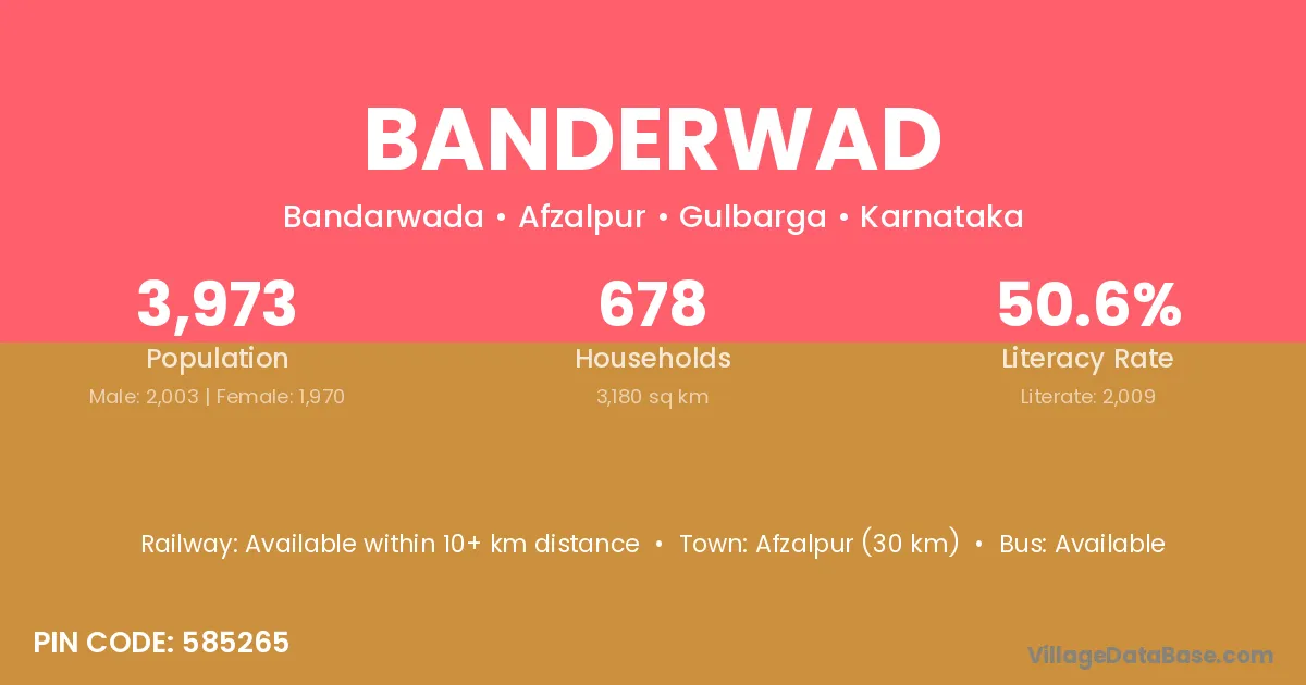 Afzalpur (30 km) is the nearest town to Banderwad village for major economic activities and is located approximately 30 km away.