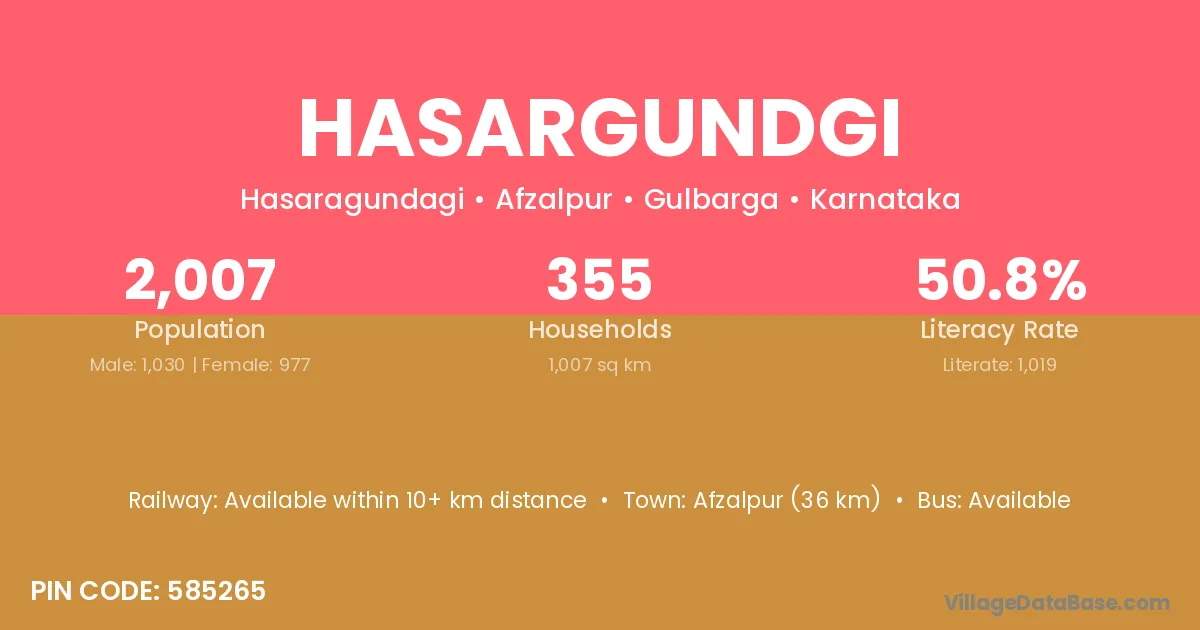 Afzalpur (36 km) is the nearest town to Hasargundgi village for major economic activities and is located approximately 36 km away.
