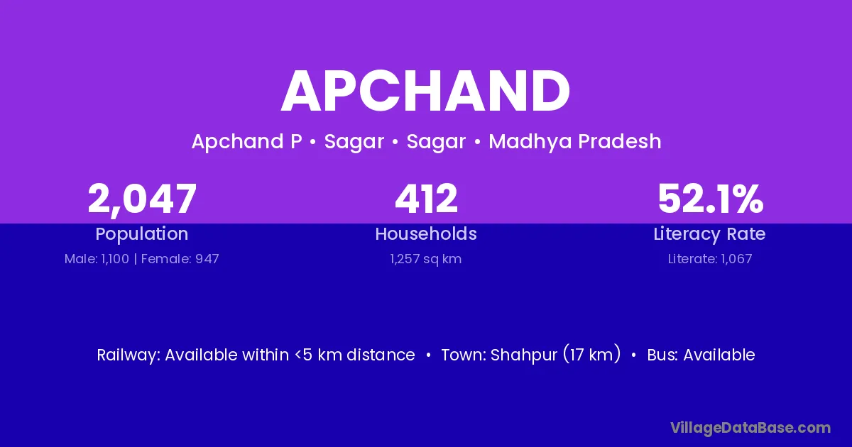 The literacy rate of Apchand village is 52.47%. Male literacy stands at 64.98% and female literacy at 40.48%.
