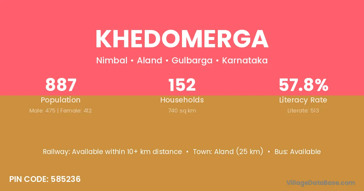 Aland (25 km) is the nearest town to Khedomerga village for major economic activities and is located approximately 25 km away.