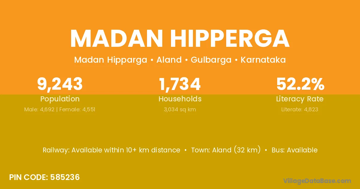 Aland (32 km) is the nearest town to Madan Hipperga village for major economic activities and is located approximately 32 km away.