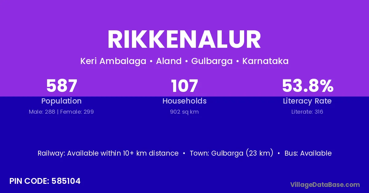 Gulbarga (23 km) is the nearest town to Rikkenalur village for major economic activities and is located approximately 23 km away.
