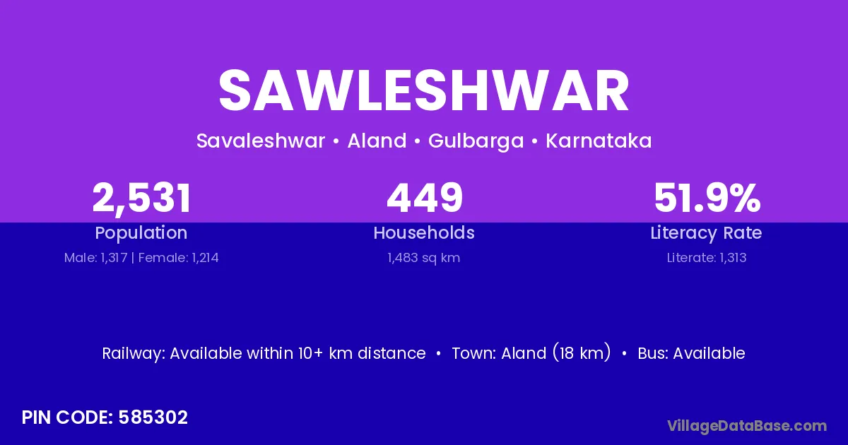 Aland (18 km) is the nearest town to Sawleshwar village for major economic activities and is located approximately 18 km away.