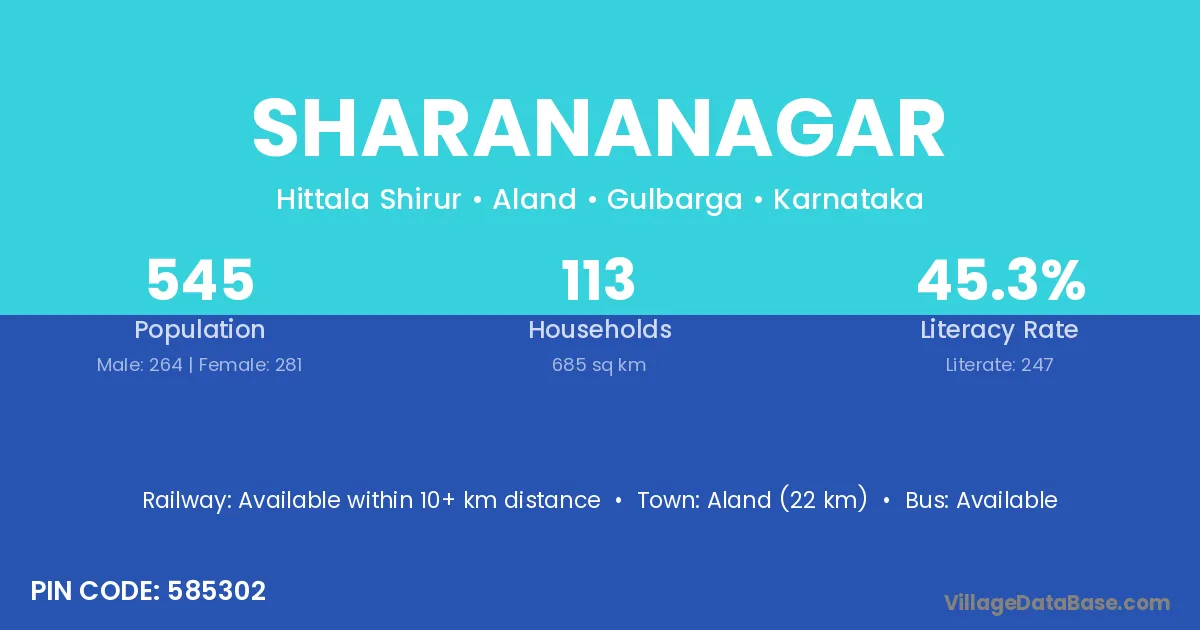 Aland (22 km) is the nearest town to Sharananagar village for major economic activities and is located approximately 22 km away.