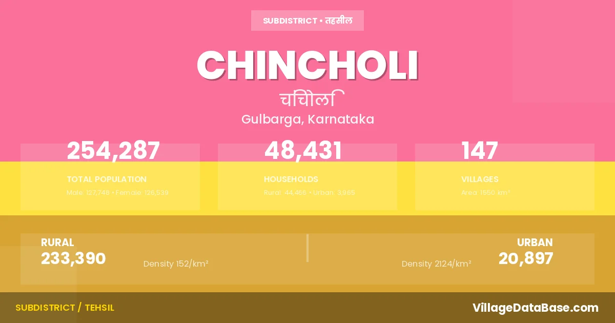 According to the 2011 census The total area of Chincholi Taluka is 1550 km², with a population of 254287 people. The population density is 164 inhabitants per square kilometre, and there are approximately 48431 houses in the sub district.