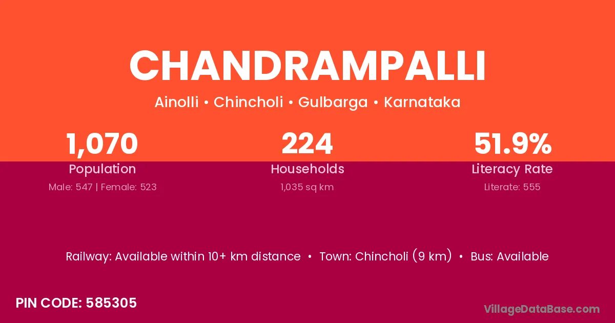 Chincholi (9 km) is the nearest town to Chandrampalli village for major economic activities and is located approximately 9 km away.