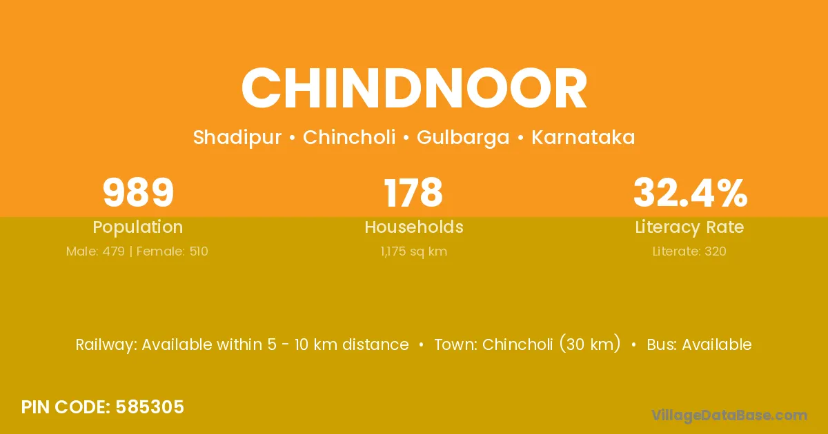Chincholi (30 km) is the nearest town to Chindnoor village for major economic activities and is located approximately 30 km away.