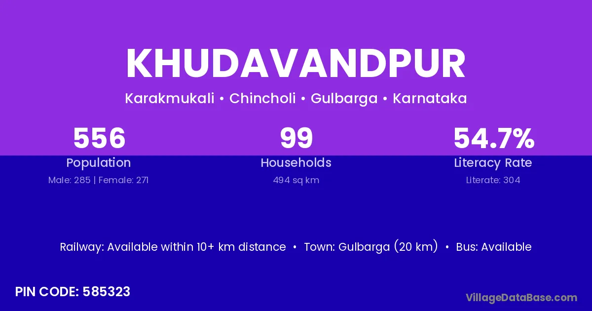 Gulbarga (20 km) is the nearest town to Khudavandpur village for major economic activities and is located approximately 20 km away.
