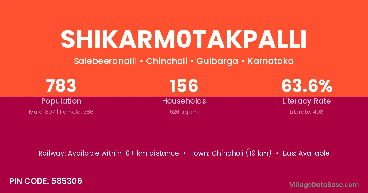 Chincholi (19 km) is the nearest town to Shikarm0takpalli village for major economic activities and is located approximately 19 km away.