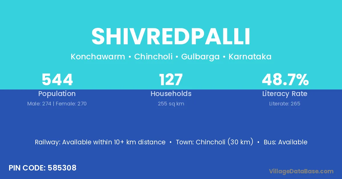 Chincholi (30 km) is the nearest town to Shivredpalli village for major economic activities and is located approximately 30 km away.
