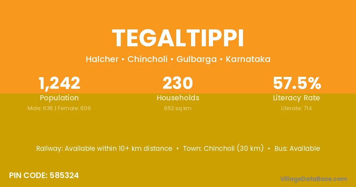 Chincholi (30 km) is the nearest town to Tegaltippi village for major economic activities and is located approximately 30 km away.