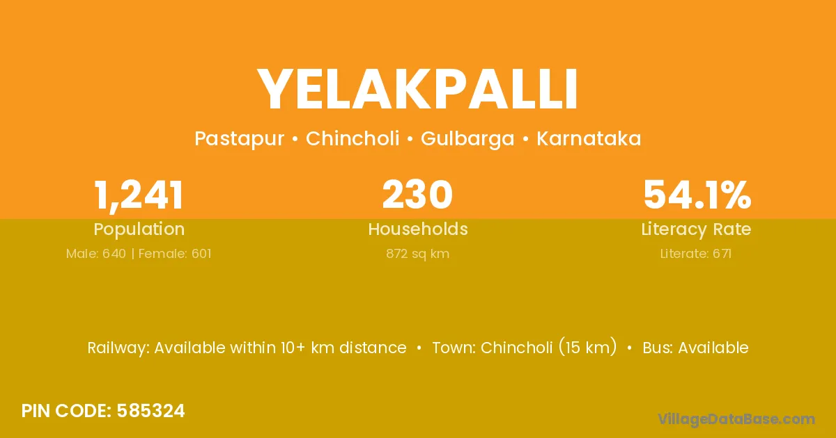 Chincholi (15 km) is the nearest town to Yelakpalli village for major economic activities and is located approximately 15 km away.