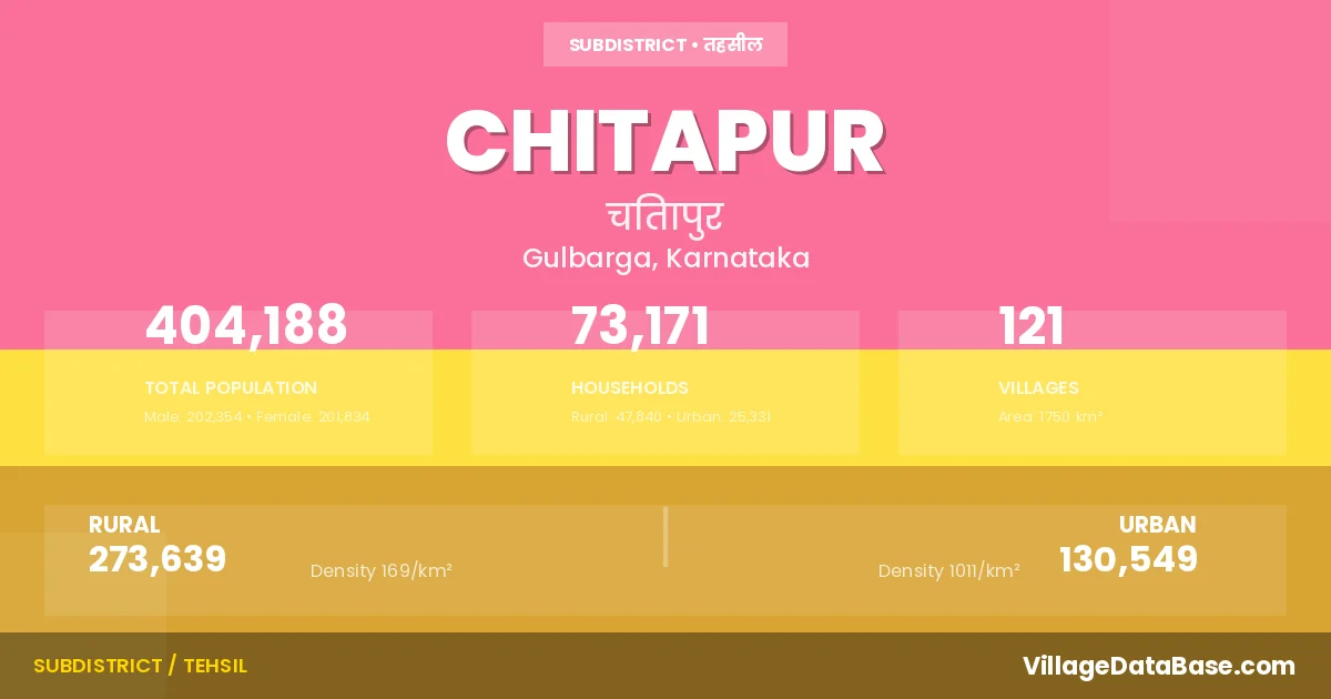 According to the 2011 census The total area of Chitapur Taluka is 1750 km², with a population of 404188 people. The population density is 231 inhabitants per square kilometre, and there are approximately 73171 houses in the sub district.