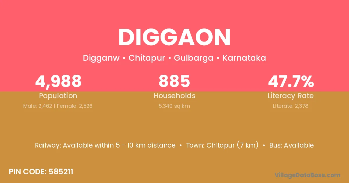 Chitapur (7 km) is the nearest town to Diggaon village for major economic activities and is located approximately 7 km away.