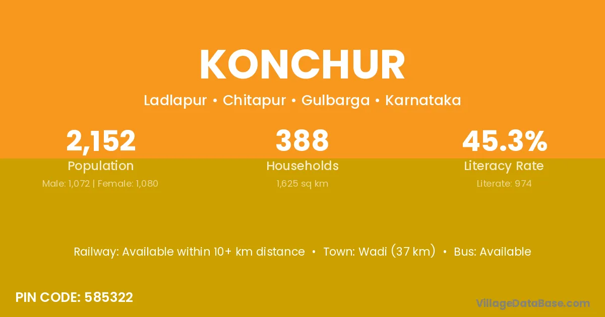 Wadi (37 km) is the nearest town to Konchur village for major economic activities and is located approximately 37 km away.