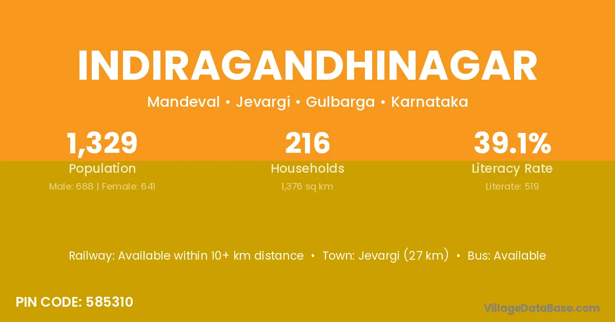 Jevargi (27 km) is the nearest town to Indiragandhinagar village for major economic activities and is located approximately 27 km away.