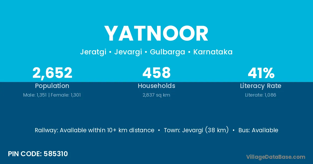 Jevargi (38 km) is the nearest town to Yatnoor village for major economic activities and is located approximately 38 km away.