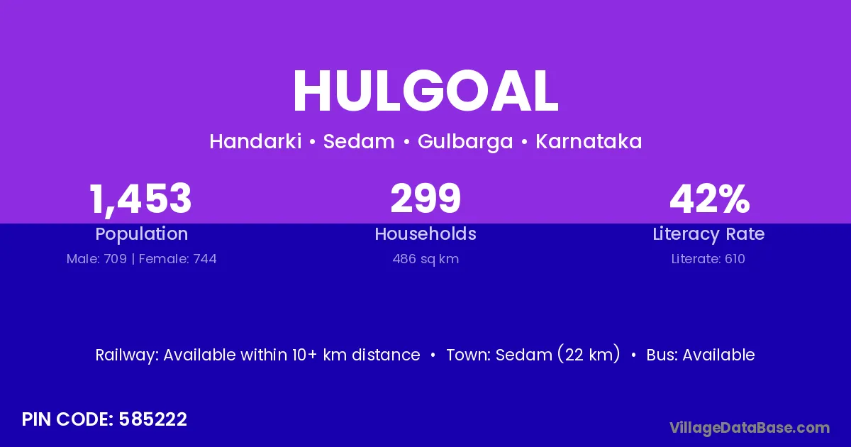 Sedam (22 km) is the nearest town to Hulgoal village for major economic activities and is located approximately 22 km away.