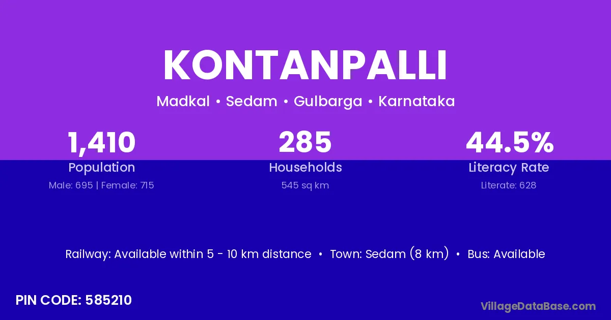 Sedam (8 km) is the nearest town to Kontanpalli village for major economic activities and is located approximately 8 km away.