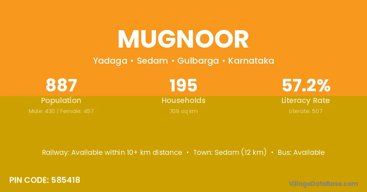 Sedam (12 km) is the nearest town to Mugnoor village for major economic activities and is located approximately 12 km away.