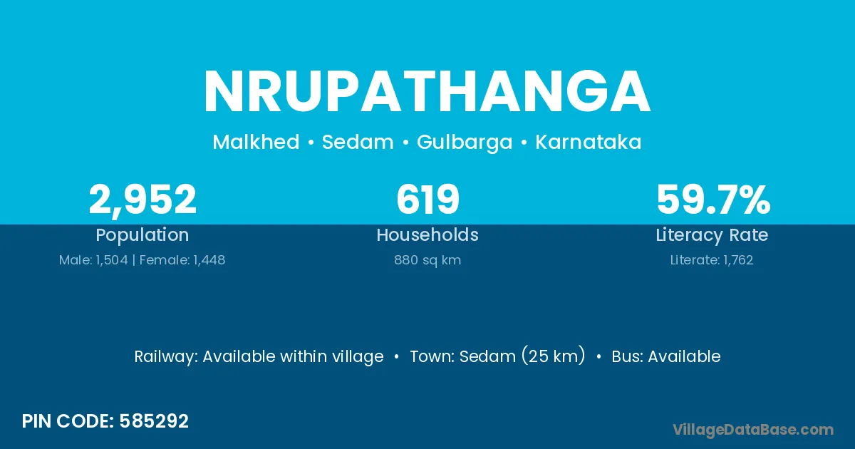 Nrupathanga village has a total population of 2,952 people, of which 1,504 are males and 1,448 are females.