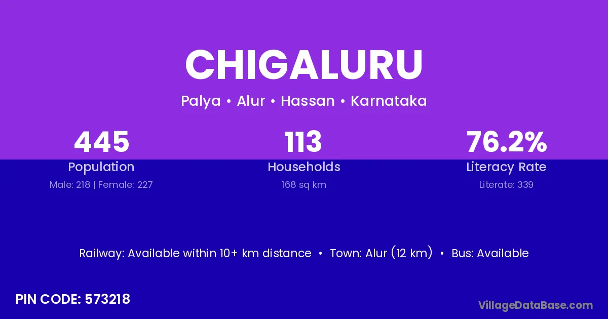 Chigaluru village has a total population of 445 people, of which 218 are males and 227 are females.