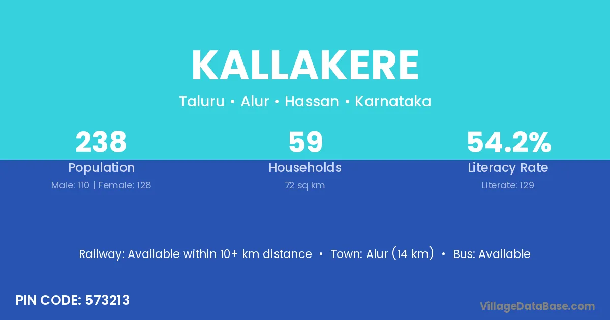 Kallakere village has a total population of 238 people, of which 110 are males and 128 are females.