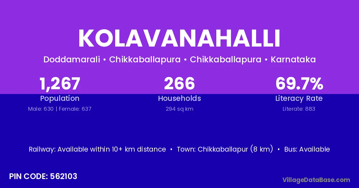 The literacy rate of Kolavanahalli village is 78.57%. Male literacy stands at 87.50% and female literacy at 66.67%.