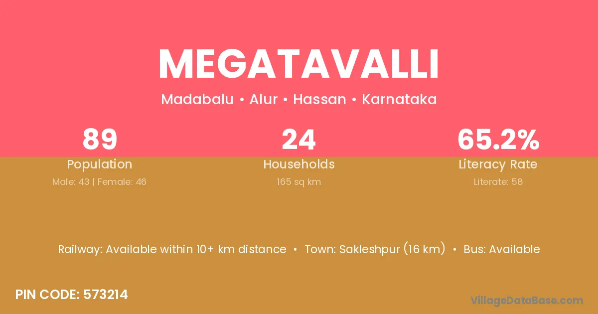 Sakleshpur (16 km) is the nearest town to Megatavalli village for major economic activities and is located approximately 16 km away.