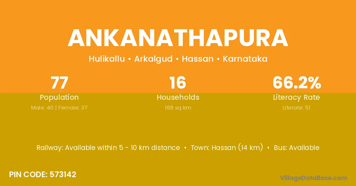 Hassan (14 km) is the nearest town to Ankanathapura village for major economic activities and is located approximately 14 km away.