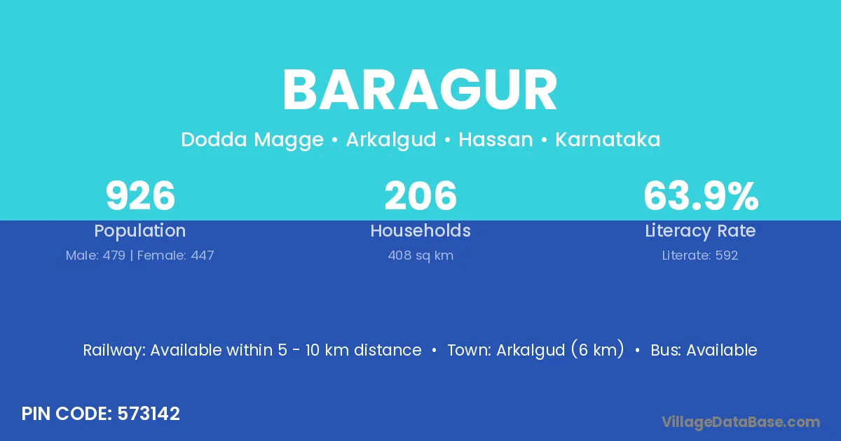 Arkalgud (6 km) is the nearest town to Baragur village for major economic activities and is located approximately 6 km away.