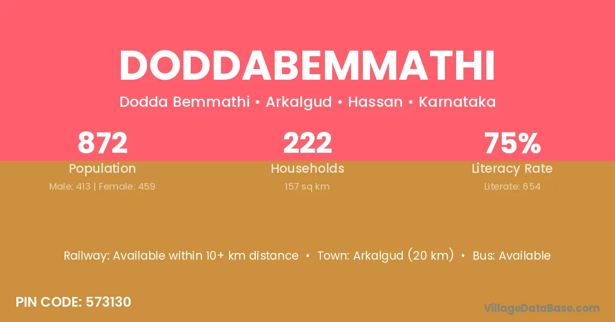 Doddabemmathi village has a total population of 872 people, of which 413 are males and 459 are females.