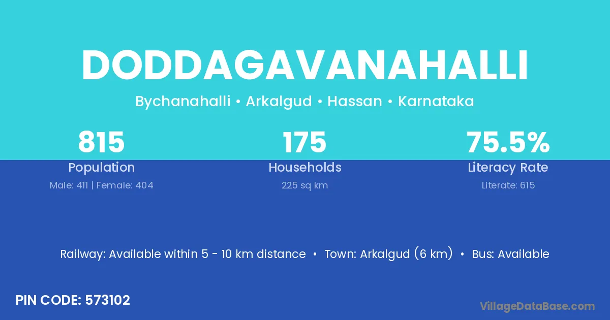 Doddagavanahalli village has a total population of 815 people, of which 411 are males and 404 are females.