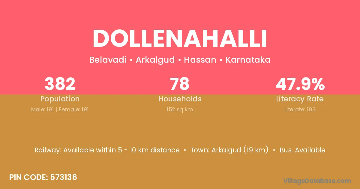 Arkalgud (19 km) is the nearest town to Dollenahalli village for major economic activities and is located approximately 19 km away.