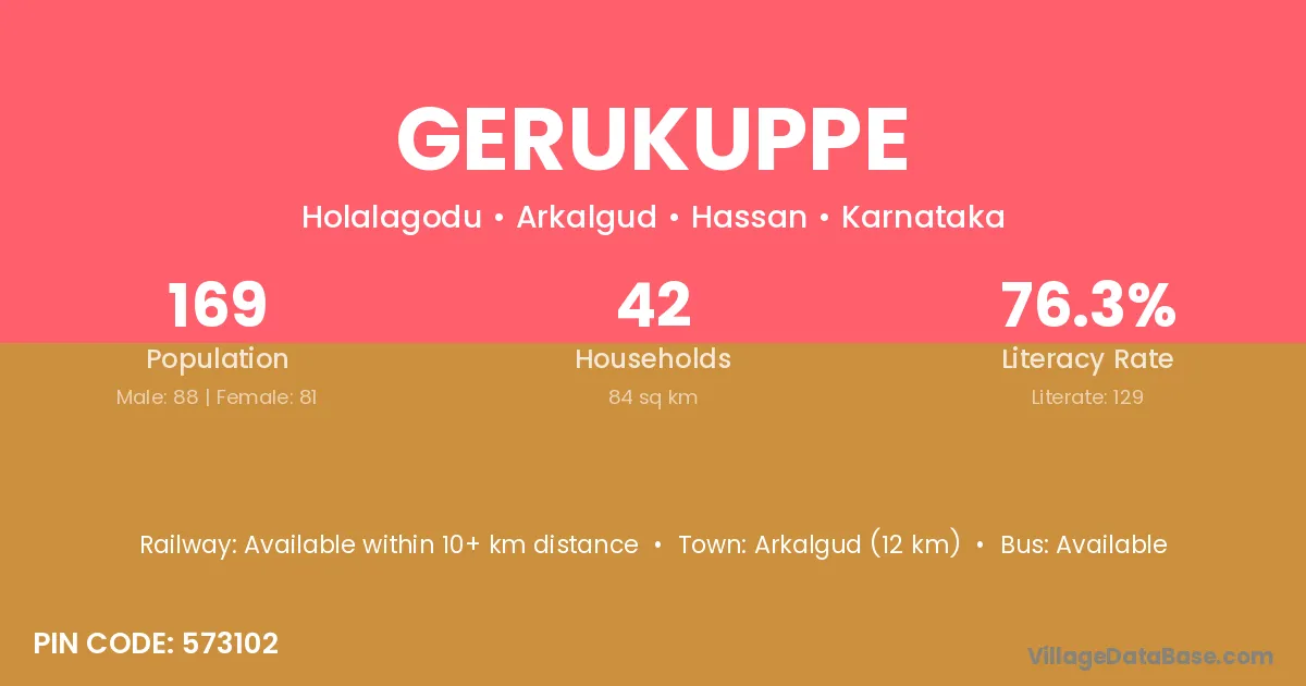Arkalgud (12 km) is the nearest town to Gerukuppe village for major economic activities and is located approximately 12 km away.
