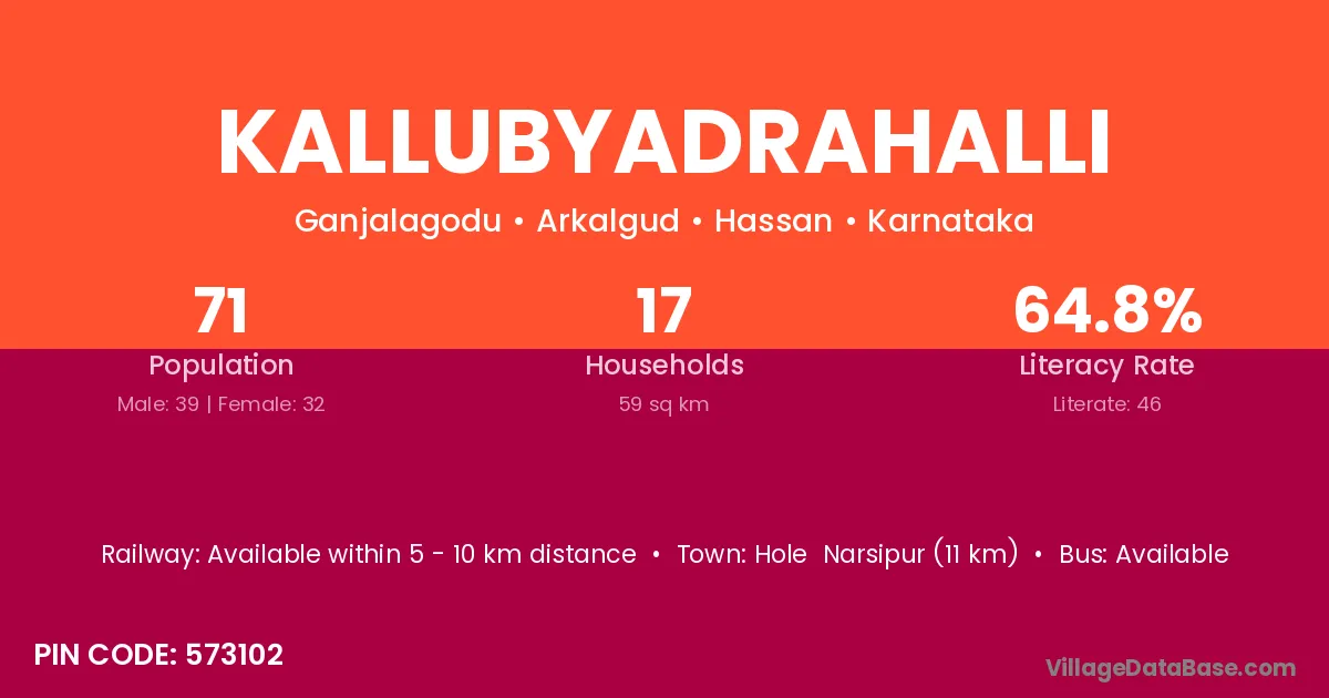 Kallubyadrahalli village has a total population of 71 people, of which 39 are males and 32 are females.