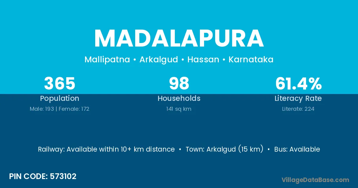 Arkalgud (15 km) is the nearest town to Madalapura village for major economic activities and is located approximately 15 km away.
