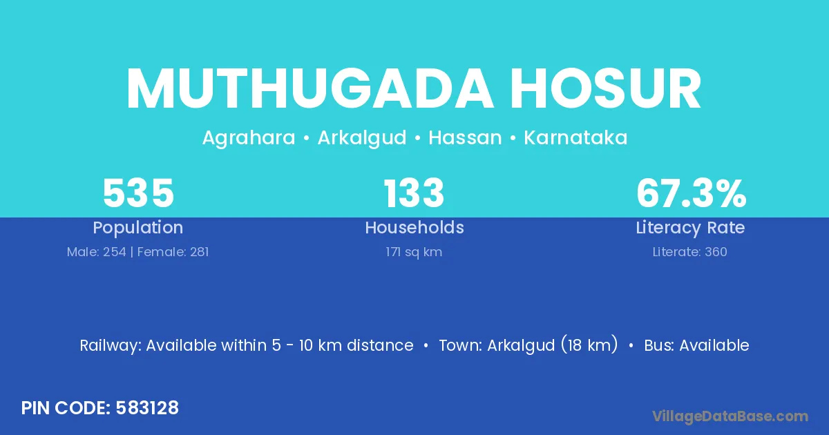 Arkalgud (18 km) is the nearest town to Muthugada Hosur village for major economic activities and is located approximately 18 km away.
