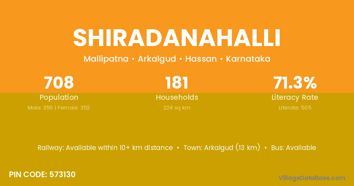Arkalgud (13 km) is the nearest town to Shiradanahalli village for major economic activities and is located approximately 13 km away.