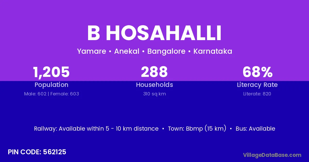The literacy rate of B Hosahalli village is 75.62%. Male literacy stands at 75.54% and female literacy at 75.69%.