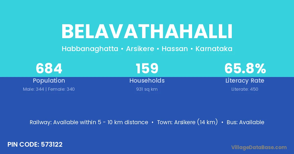 Arsikere (14 km) is the nearest town to Belavathahalli village for major economic activities and is located approximately 14 km away.