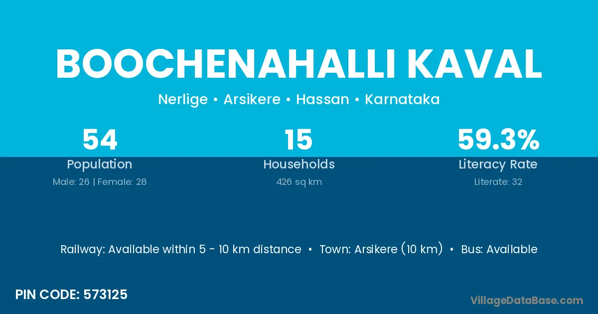 Arsikere (10 km) is the nearest town to Boochenahalli Kaval village for major economic activities and is located approximately 10 km away.