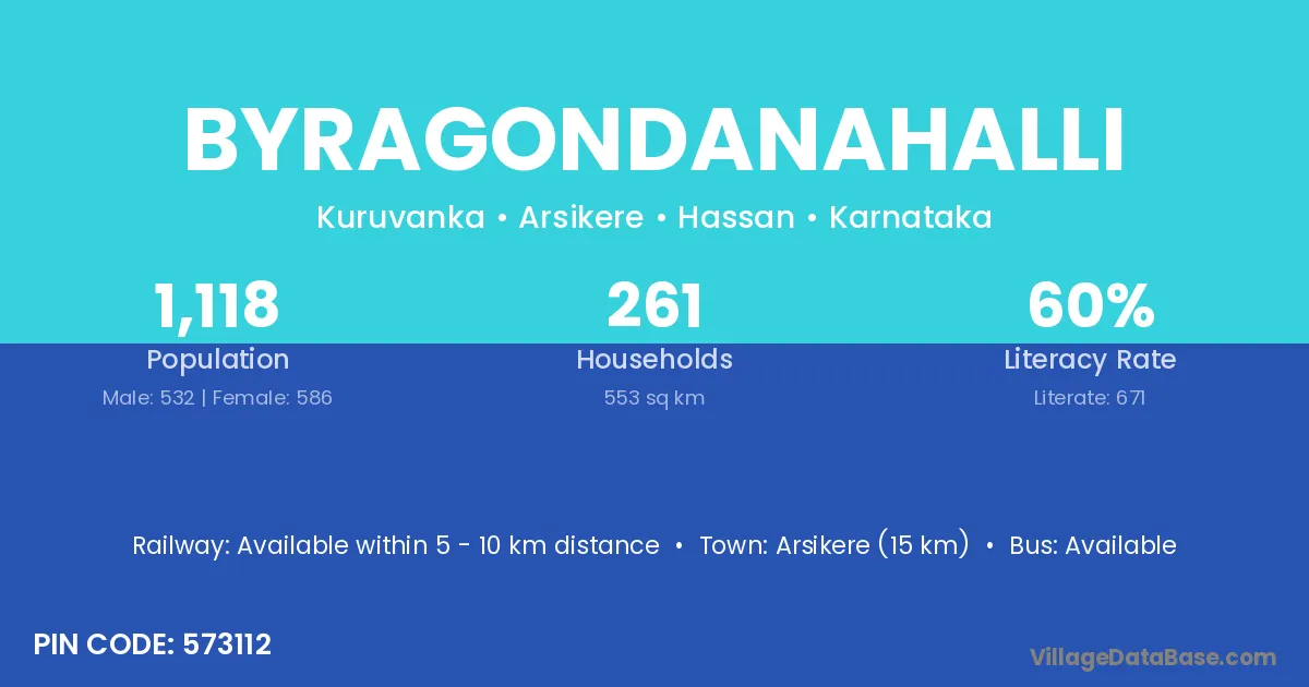 Arsikere (15 km) is the nearest town to Byragondanahalli village for major economic activities and is located approximately 15 km away.