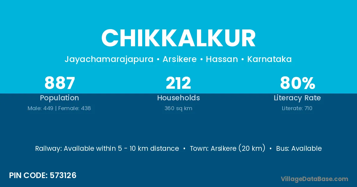 Arsikere (20 km) is the nearest town to Chikkalkur village for major economic activities and is located approximately 20 km away.