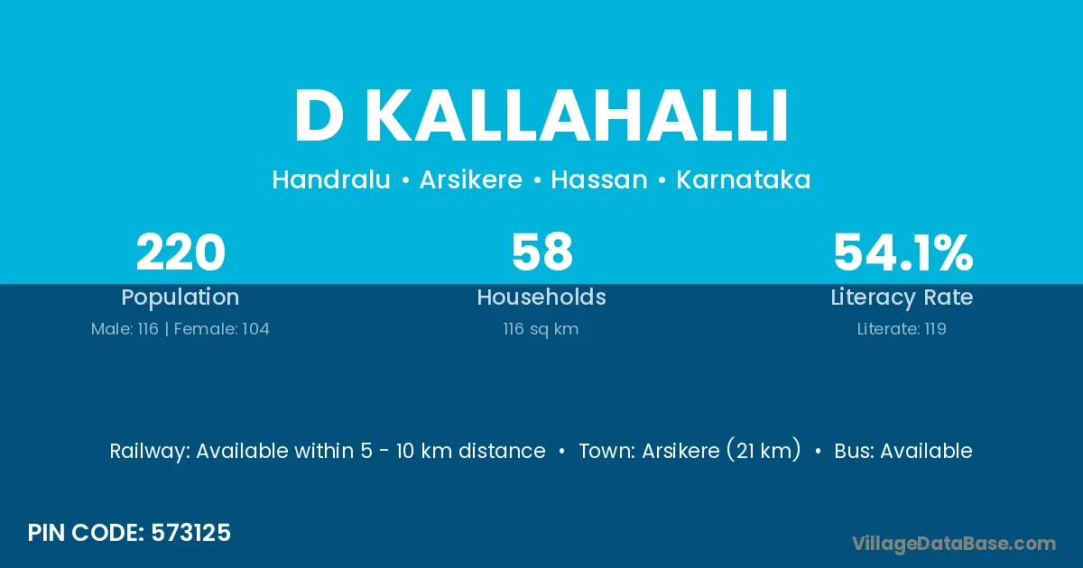 Arsikere (21 km) is the nearest town to D Kallahalli village for major economic activities and is located approximately 21 km away.