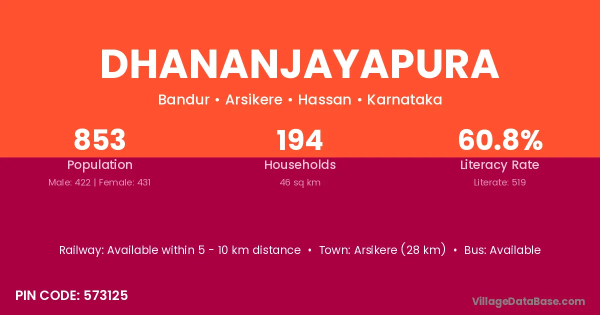 Arsikere (28 km) is the nearest town to Dhananjayapura village for major economic activities and is located approximately 28 km away.