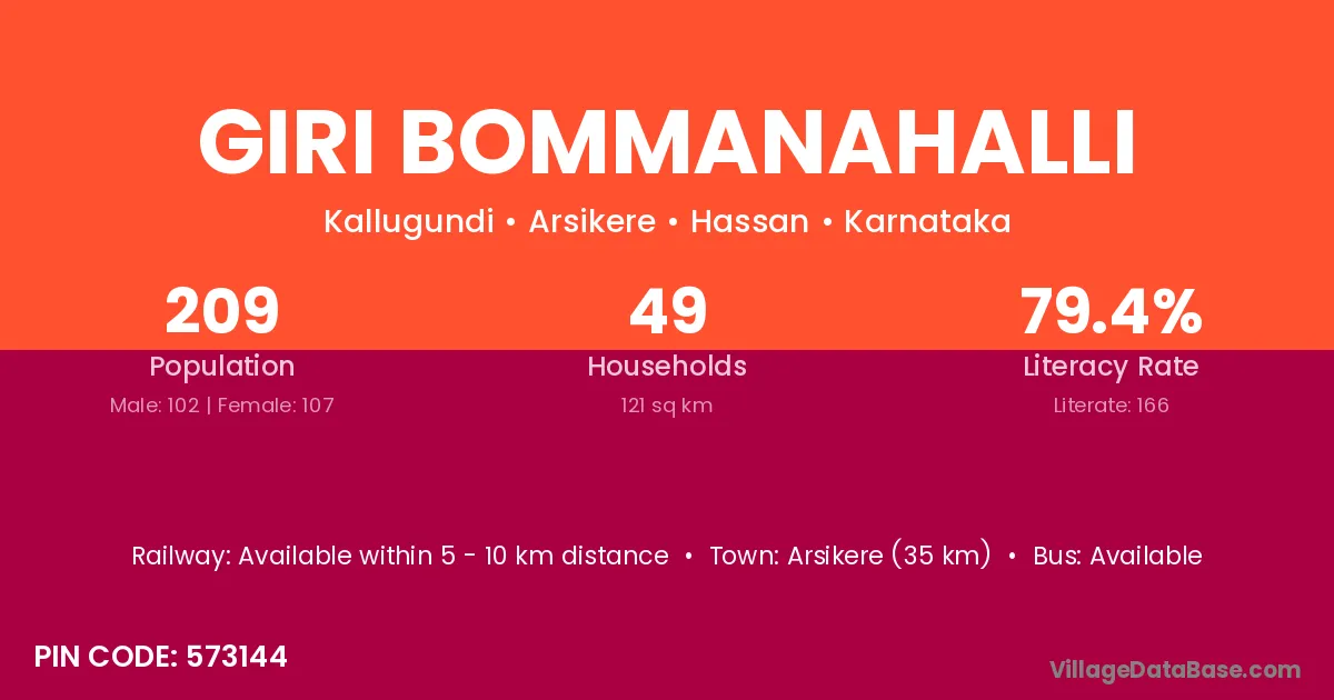 Arsikere (35 km) is the nearest town to Giri Bommanahalli village for major economic activities and is located approximately 35 km away.