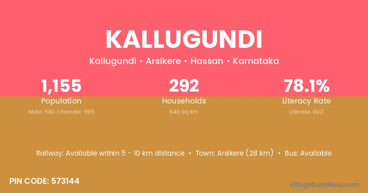Arsikere (28 km) is the nearest town to Kallugundi village for major economic activities and is located approximately 28 km away.